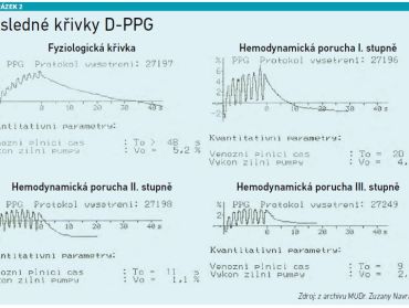 Vyšetření trvá jen několik minut, může je provádět vyškolená sestra a interpretaci pak provádí lékař. D‑PPG umožňuje objektivizovat potíže pacientů i v případech, kdy duplexní sonografie neodhalí významné anatomické změny, a je velmi vhodná pro hodnocení účinnosti konzervativní i chirurgické léčby (viz obrázek 2).